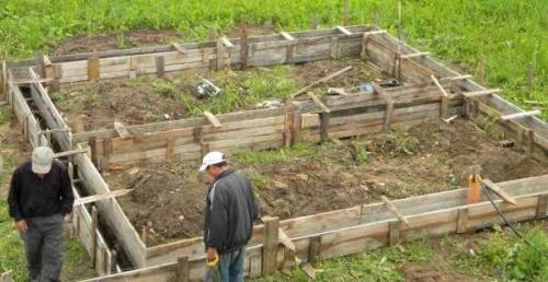 Фаррелл копает фундаменты шириной 2 фута с дополнительными 2 футами с каждой стороны для места для работы, в результате чего получается траншея шириной 6 футов. Он использует доски размером 2 × 10 футов в качестве фундамента, которые снимаются после застывания бетона.