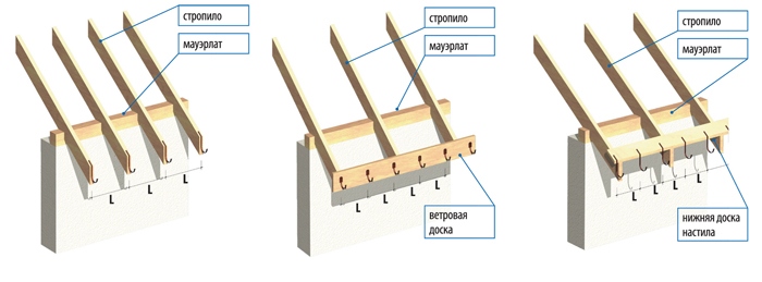 - Если лобовая доска отсутствует, крепите кронштейны на стропильные ноги.