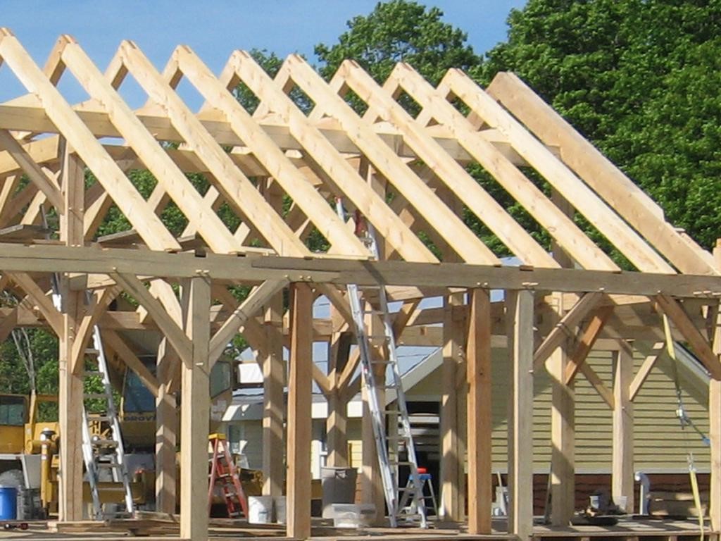 Вместе с тремя помощниками поднимите раму на место, установив вырезы «птичьего рта» на поперечные балки.