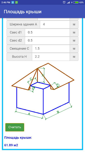Для получения результата необходимо ввести информацию о здании и ширине крыши, длине, материале перекрытия сверху и сбоку: размеры крыши: высота, размер свеса; Если длина и ширина основания крыши составляет 100 м и 70 м, а уклон крыши составляет 45 градусов, подъем крыши (H) = (B x tan α) / 2 Более дорогая черепица из коричневого асфальта.Двускатная крыша Двускатная крыша имеет две противоположные стороны с равными уклонами и равными пролетами, которые встречаются в центре крыши у конька. Фронтальные и шатровые крыши будут иметь одинаковую площадь при условии, что поле останется прежним. Это дает вам 5 590 квадратных футов, что является реальной площадью поверхности крыши. = 2 x 60,6218 x 100 Чтобы найти площадь треугольной крыши, умножьте длину нижнего края на длину конька, затем разделите произведение на 2. Калькулятор водосточной трубы. Как рассчитать длину вальм на крыше 21 декабря 2016 года.- сайт нашего партнера. = 35 м = 49,4975 м. Общее количество необходимой черепицы = количество пакетов, необходимых для покрытия крыши, но без добавления дополнительных пакетов, необходимых для обшивки коньков и начальных полос Тип крыши (двускатная или шатровая) Используя эти четыре входа, вы получите несколько основных выходов : Площадь крыши (измеряется в квадратных футах) Количество квадратов. Калькулятор площади вальмовой крыши. Продолжая просматривать сайт, вы соглашаетесь на использование файлов cookie. Найдите площадь своей крыши или откройте для себя другие инструменты для кровли: калькуляторы черепицы, щипцы, навесы, вальмы, калькуляторы шага.А для крыши с уклоном 6:12 это число, 1,118, является множителем уклона крыши. Калькулятор вальмовой крыши Этот калькулятор поможет вам оценить параметры вальмовой крыши, включая стропила и площадь крыши. Person_outline Anton schedule 2011-08-29 10:13:49 Выберите следующую информацию, используя раскрывающиеся списки, чтобы ввести значения в футах и дюймах. Используйте крышу Saltbox для расчета двухсторонней крыши с разными уклонами, пролетами и / или свесами для каждой стороны крыши. Информация, представленная на нашем сайте, носит общий характер и не должна использоваться для покупки строительных материалов — для этого обратитесь к специалисту.Как рассчитать площадь крыши… Ответ Возьмите площадь основания крыши, скажем, 5 000 квадратных футов, и умножьте 5 000 на 1,118. = 70 / (2 x cos 45) = 60,6218 м Обычные стропила (R) = B / (2 x cos α) Калькулятор площади вальмовой крыши рассчитывает высоту и площадь крыши. Вот онлайн-калькулятор площади вальмовой крыши, который поможет вам рассчитать параметры вальмовой крыши, такие как высота крыши, длина обычных и шатровых стропил, а также площадь крыши на основе ширины, высоты основания крыши и уклона крыши (одинаковы для всех сторон).Расчет площади, шага и других важных размеров, расхода материалов. Для расчета вальмовой крыши Выберите вальмовую крышу в раскрывающемся списке «Тип крыши» или нажмите соответствующую кнопку на панели инструментов, чтобы рассчитать вальмовую крышу. Для ремонта или просто для проверки здания? Калькулятор каркаса вальмовой крыши возвращает значение основного стропила, бокового стропила, длину бедра, высоту коленной стенки и длину стропил домкрата. Введите длину пристройки в поле «Длина стены» и удвойте ширину пристройки, а затем минус толщину гребня в поле «Ширина стены».Вы знаете, как измерить