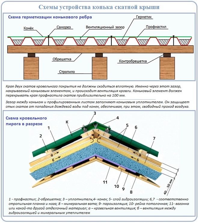 Мы уже подробно говорили, о том, какую планку лучше брать для конька, какой зазор оставлять, но я всё же повторюсь, а кому захочется узнать больше, прочитайте статью о монтаже узлов кровли из металлочерепицы.