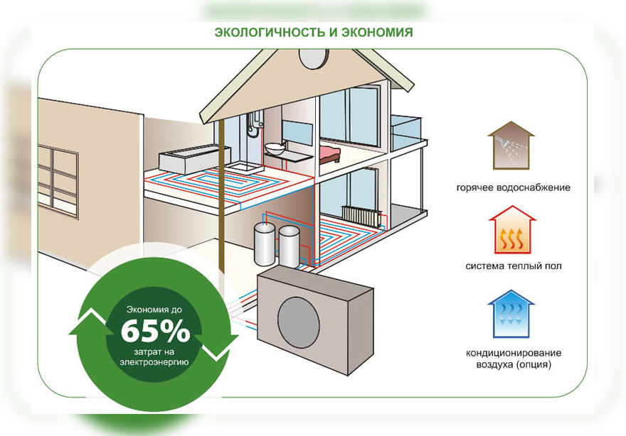 Геотермальные тепловые насосы нагревают дом, используя энергию земли или воды. В летнее время такая система работает как кондиционер, т.е. помогает охлаждать здание, возвращая избыточное тепло земле. Это экологически чистый вид отопления, при котором используются возобновляемые ресурсы.