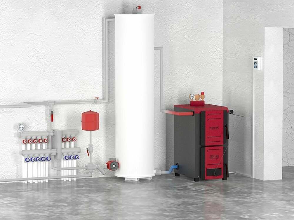 Твердотопливный котел отличается от дизельного или газового котла тем, что он не может перекрыть подачу топлива — как только вы положите дрова или уголь в топку, он продолжает гореть. Вот почему нам нужен резервуар для хранения воды — для поглощения лишнего тепла, когда котел горит, но нагрев не требуется.