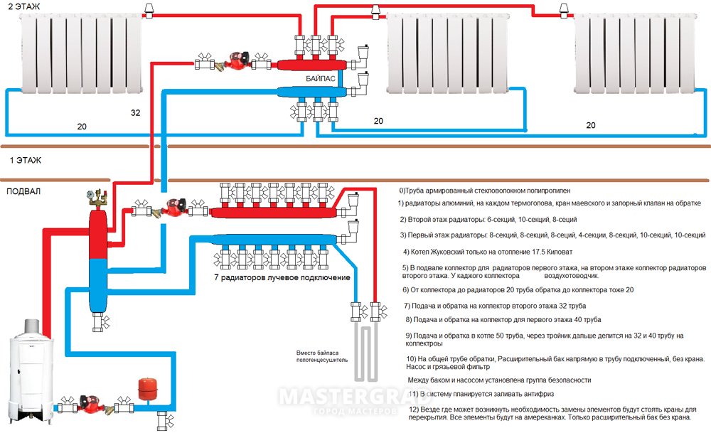 - Последовательность подключения всех элементов системы, включая трубопроводы, запирающую и регулирующую арматуру, котел и насосное оборудование.
