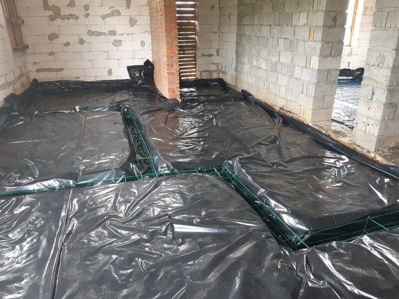Например, если стены дома возводятся в то время, когда черновая стяжка уже была залита, то можно применить любой гидроизоляционный материал, тем более, если сверху планируется проводить монтаж дополнительного утепления или одной из систем обогрева «теплый пол».