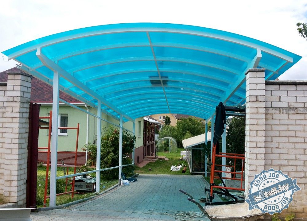 Есть немало фирм, специализирующихся на изготовлении навесов с прозрачным покрытием. Наиболее экономичный путь предполагает заказ у них готовых металлических конструкций, самостоятельную покупку листового поликарбоната и монтаж своими силами.