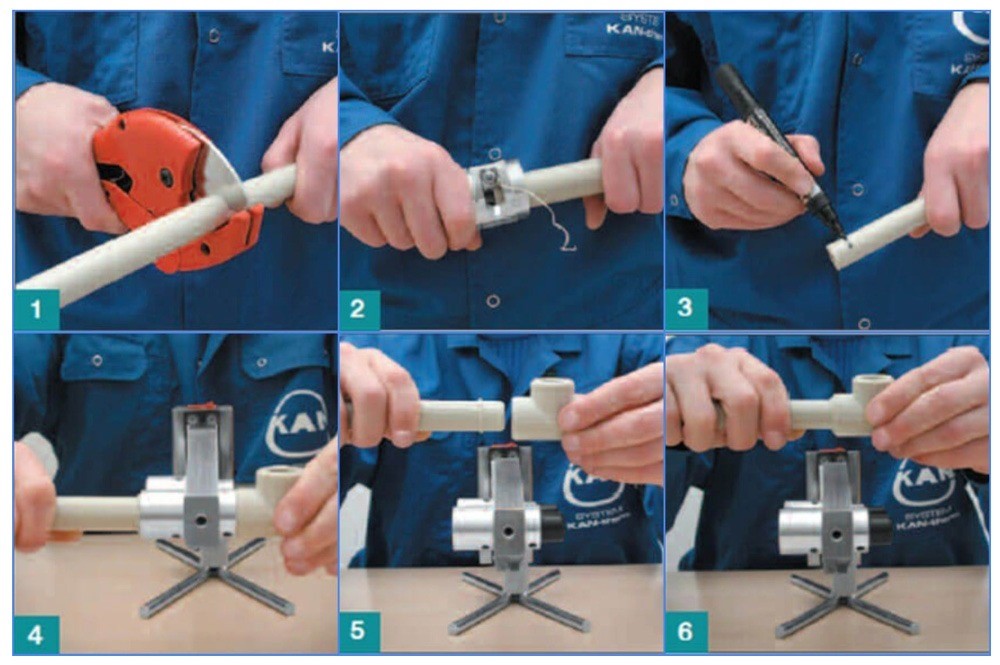 Перед операцией концы полипропиленовых труб обрезают перпендикулярно оси, заусеницы убирают, элементы очищают от пыли и обезжиривают.
