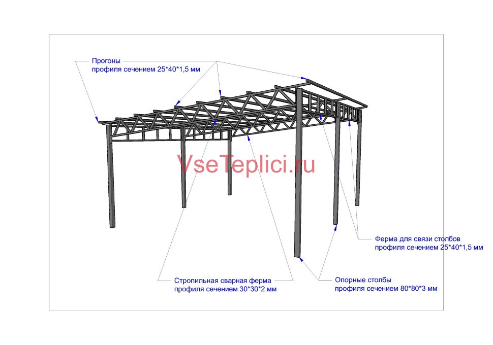 Чтобы каркас для навеса из профильной трубы был надёжен, следует правильно выбрать его составляющие. Металлопрокат выпускает множественные параметры – от 20 до 110 мм по ширине стенок и толщине от 3 до 8 мм.
