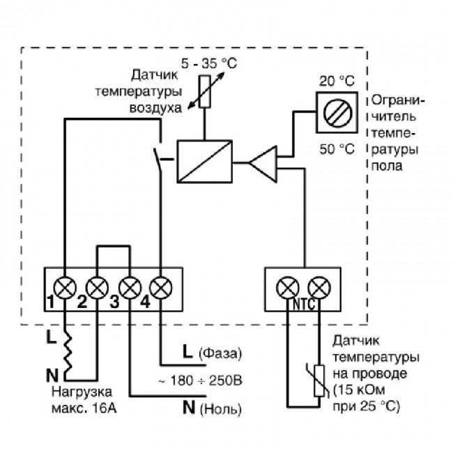 Затем подключают проводку элемента к клеммам прибора. Обязательно нужно соблюдать порядок подключения фаз, в этом поможет схема подключения терморегулятора теплого пола.