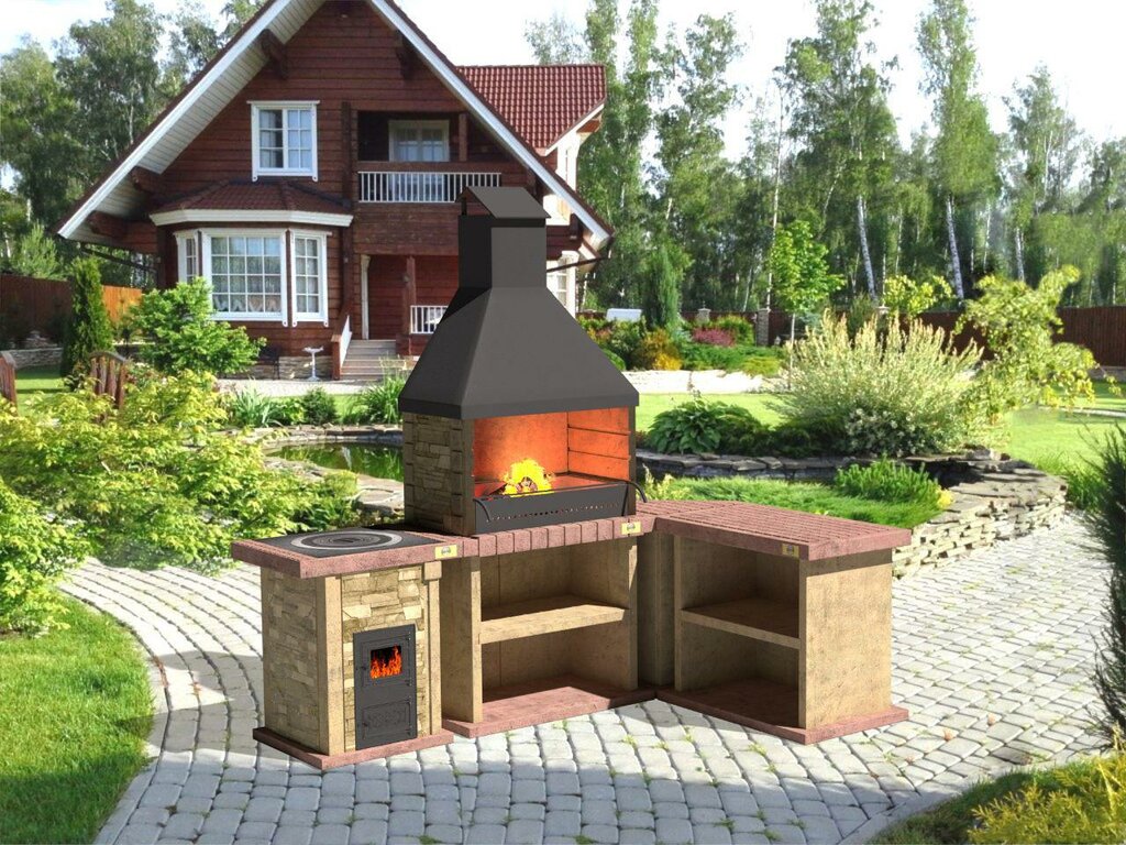 На таких печах можно приготовить отменные блюда.Барбекю-мангал предусматривает наличие решёток, вертела для жарки мяса и места для шампуров. Это сооружение станет предметом ландшафтного дизайна, и при правильной кладке прослужить десятилетия. Надстройкой лучше смонтировать навес, тогда никакие осадки не будут страшны и можно пользоваться в любое время года.