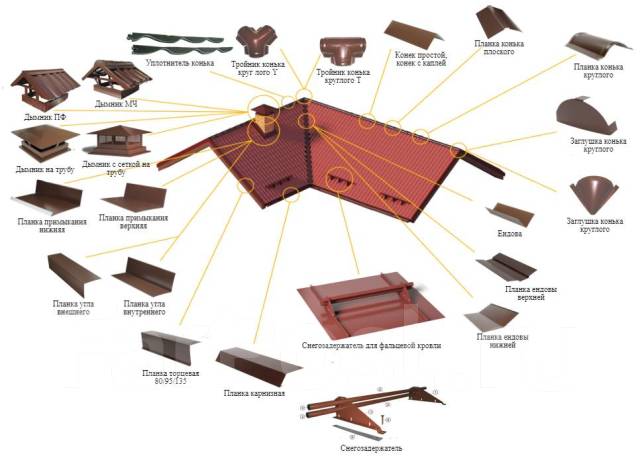 Гидроизоляционную и декоративную функцию также выполняет он. Большей популярностью пользуются коньковые профили, карнизные и торцевые планки. Их используют для возведения не только крыш сложной конструкции, но и крыш, имеющих простое строение.