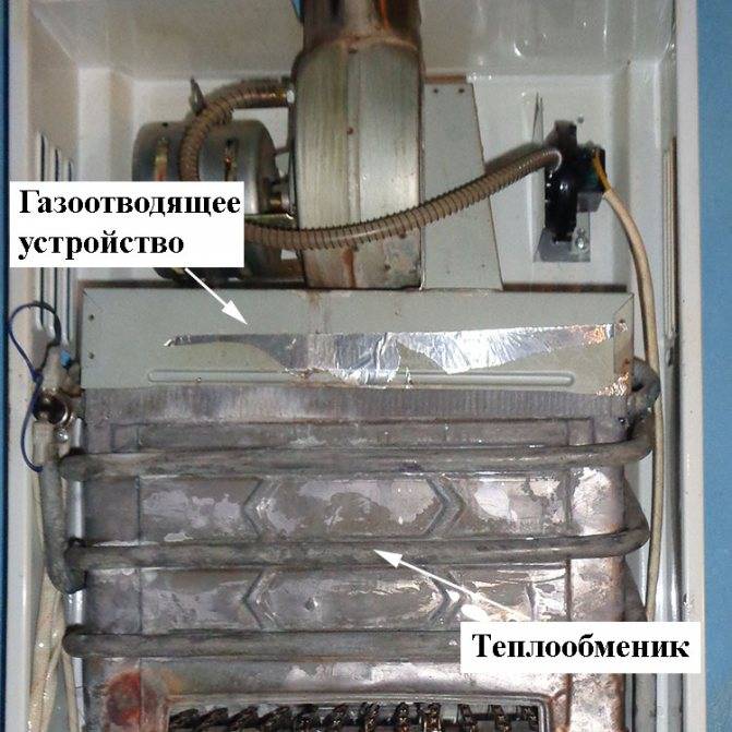 Необходимо снять теплообменник, открутив болты. Перед этим нужно перекрыть под водонагревателем все краны, газовый вентиль. Очистить его от накипи, используя специальное готовое химическое средство или обычную лимонную кислоту.