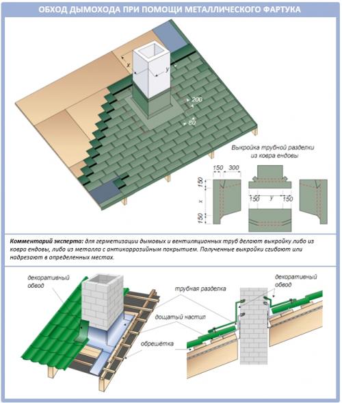 Для его сооружения понадобятся планки примыкания. Их помещают снизу трубы дымохода. Их прикладывают к трубе и по верхней части делают отметки.