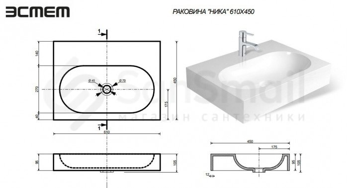 Прочный, стойкий к ударам, трещинам, сколам умывальник может быть разного размера и формы, высоты бортика.