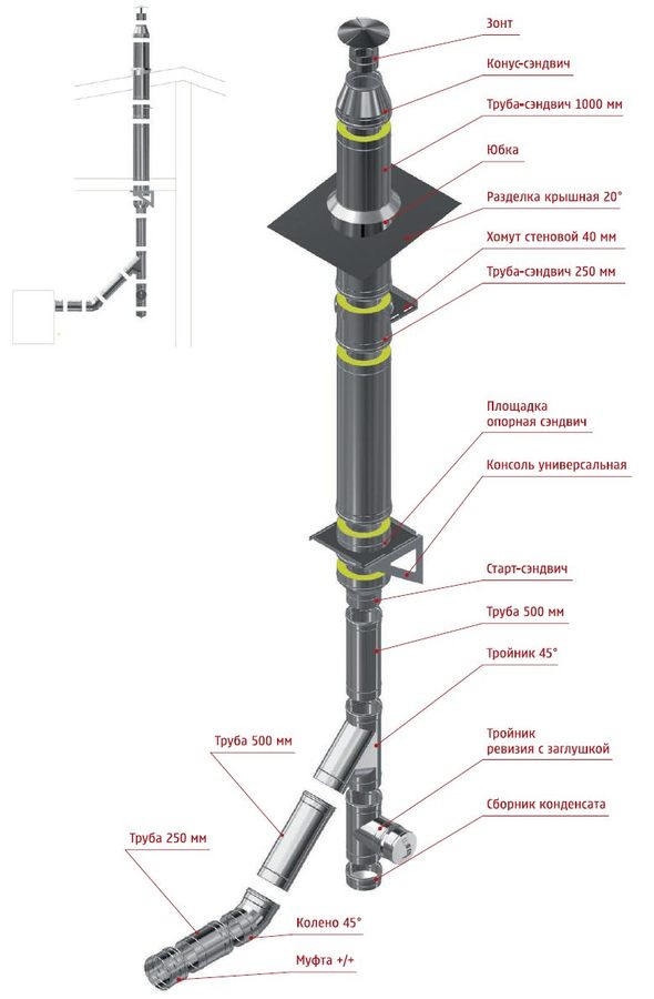 Прослойка представлена негорючей теплоизоляцией из базальтовой изоляции. Оба дымохода производятся из маркированной нержавеющей и оцинкованной стали.