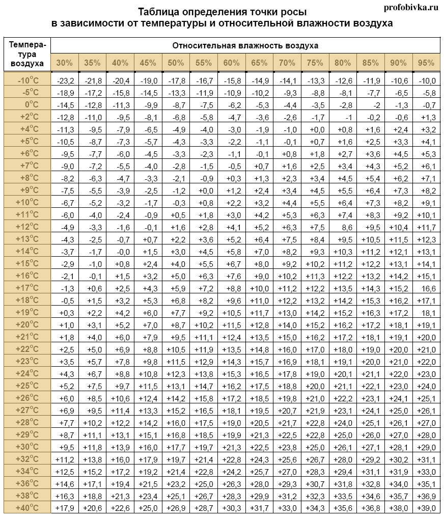 Чтобы определить точку росы по приведенным ниже таблицам, найдите температуру соответствующего воздуха в левой части таблицы.