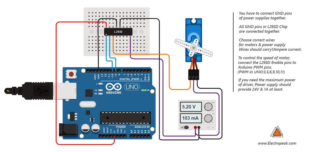 Сервопривод получает питание непосредственно от адаптера переменного тока, а не от Arduino, поскольку количество тока, которое может подавать Arduino, ограничено, а для поворота вала ручки требуется приличный крутящий момент.