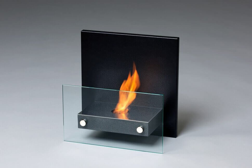 Такая компоновка даёт максимальную близость к огню, что негативно сказывается на пожарной безопасности изделия. Практически все настольные камины имеют одну общую деталь — «колодец» со светопрозрачными стенками в виде колбы или трубы прямоугольного сечения.