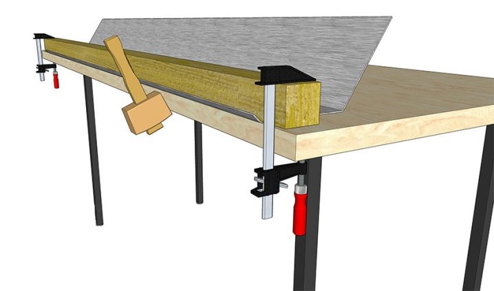 Чтобы предотвратить смещение заготовки, её необходимо закрепить при помощи струбцин. После этого на край листа укладывают отрезок стальной трубы диаметром от 100 мм, который с торцов также следует зафиксировать зажимами. Далее, заготовку постепенно огибают вокруг шаблона, простукивая деревянной киянкой по всей её поверхности. После того как жёлоб приобретёт необходимую форму, струбцины снимают и приступают к изготовлению следующего изделия. Чтобы получить жёлоб полукруглой формы, используют трубу подходящего диаметра - Г-образный отлив сделать ещё проще. Для этого находят середину листа с каждой стороны и отчерчивают осевую линию. Изгиб выполняют при помощи металлического уголка или деревянной рейки, которую крепят на краю верстака. Заготовку укладывают так, чтобы её осевая линия находилась строго над ребром шаблона и простукивают киянкой для получения изгиба под углом 90o. П-образный жёлоб формируют таким же образом, но наносят две параллельные линии на расстоянии 60–80 мм от внешнего края заготовки и выгибают два прямых угла.