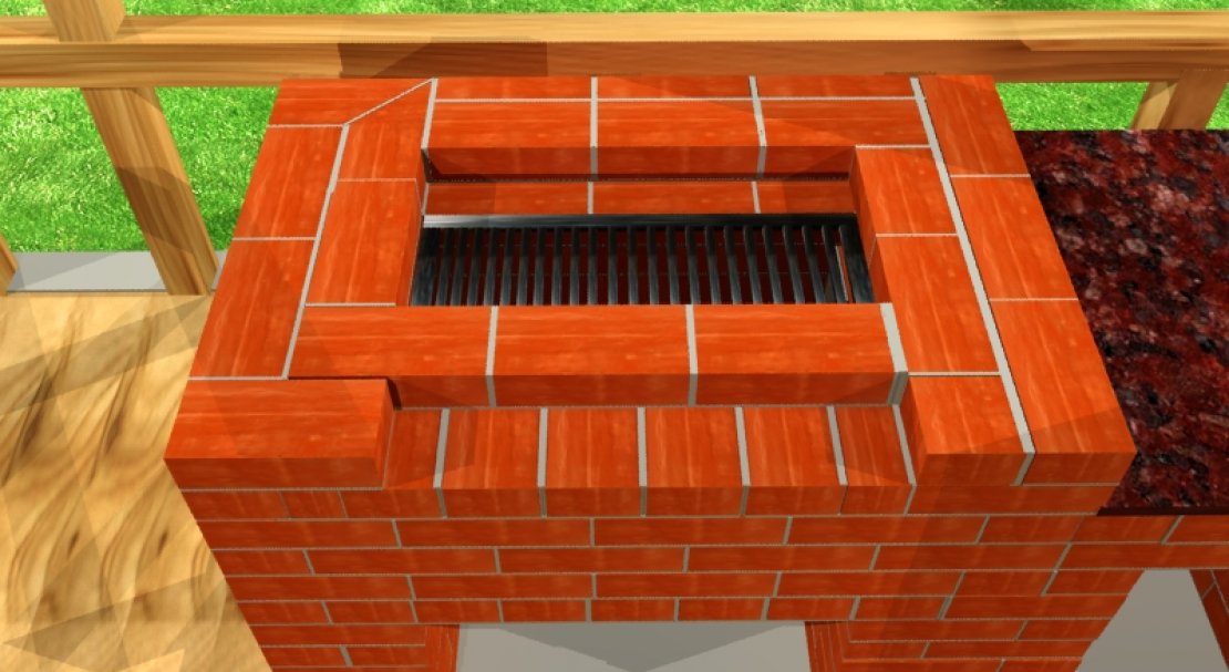 Там, где кирпич не будет подвергаться чрезмерному нагреванию, дорогой термостойкий кирпич можно заменить на обычный красный. Для жаровни понадобится поддон из металла и решетка.Не забываем про плитку, которую мы будем использовать в качестве столешницы.