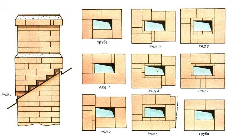 Далее следует класть кирпич с уширением, при этом уширение, или распушка, выполняются так, что основной дымовой канал не меняет своего сечения.