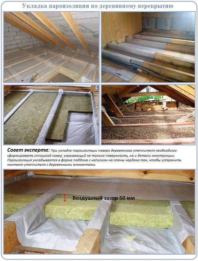 Чтобы утеплитель качественно выполнял свою задачу, перед тем как утеплять крышу дома, его нужно защитить пароизоляционным материалом. Слой пароизоляции укладывают таким образом, чтобы между утеплителем и гидроизоляцией кровли осталась воздушная прослойка для вентиляции. Ширина данной прослойки зависит от материала кровли.