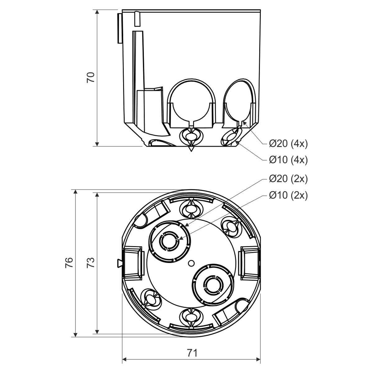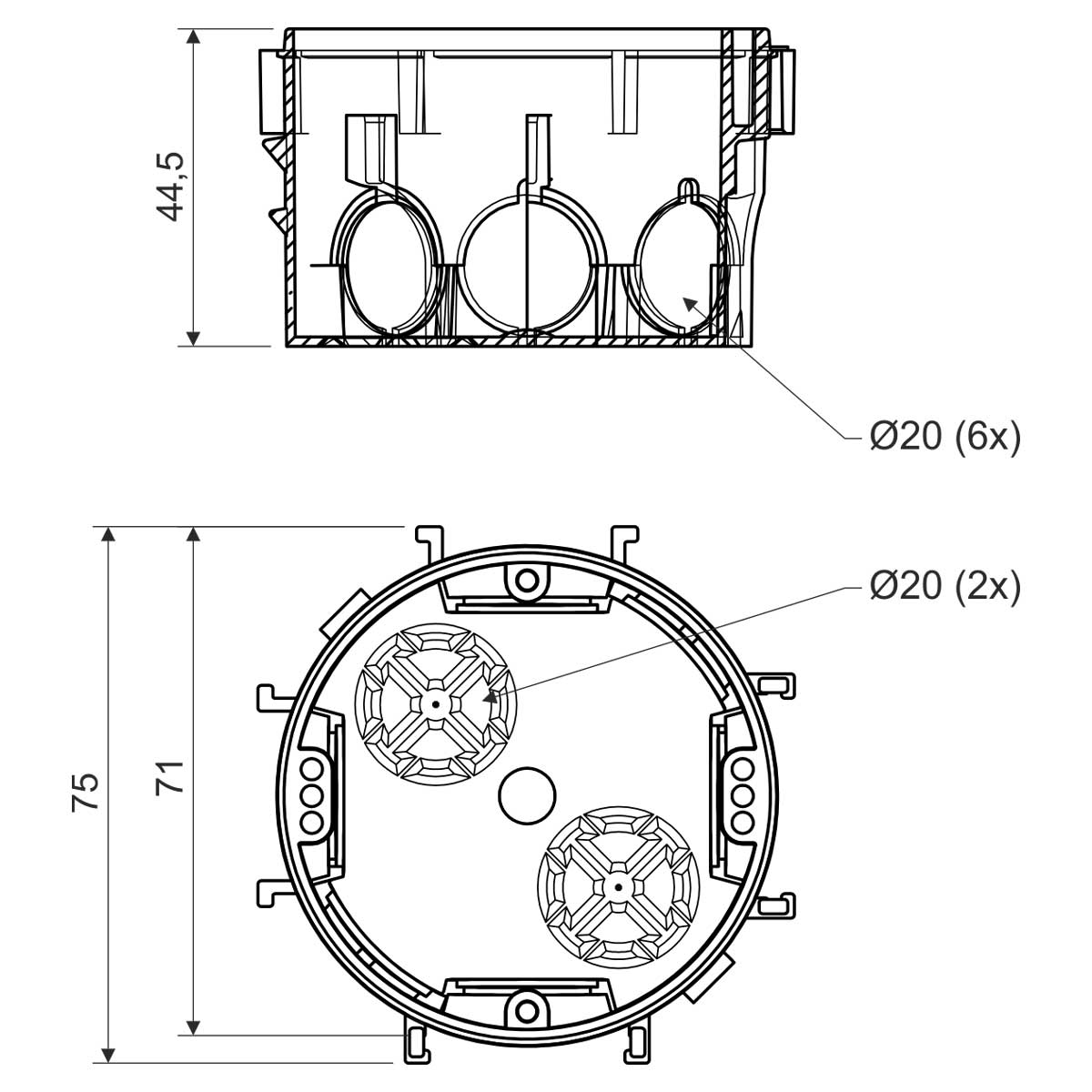 Его устанавливают для безопасности, длительной работоспособности и удобства закрепления устройства. Представляет собой цилиндрический стакан с отверстиями под завод провода и креплениями (для гипсокартона).