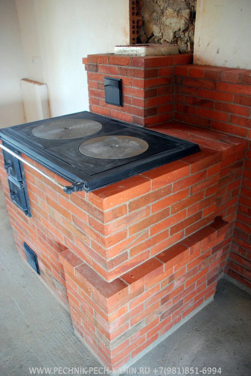 Как правило, кирпичный агрегат делается на два с половиной глиняного блока. В качестве топлива используются сухие дрова, угли которых длительное время отдают тепло стенкам изделия. Шамотным кирпичом сооружается печка, в соединительный состав также добавляется шамотный порошок.Кладка всегда осуществляется на специально возведенном фундаменте. Если планируется плита для нагрева пищи и воды, длина шамотных «пазлов» увеличивается.