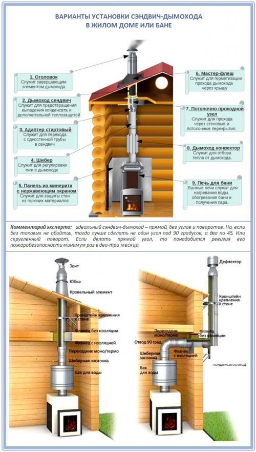 Во избежание контакта дымохода с фрагментами кровельного пирога используется защитный кожух. Выход конструкции через крышу тщательно герметизируется. Стыки закрываются специальным фартуком.