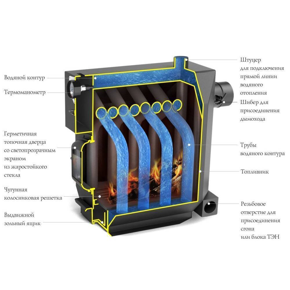 В этом случае сложная система внутренних дымоходов затрудняет и подавляет стремительный процесс горения, увеличивая интервалы между загрузками очередной партии дров в топку и позволяя увеличить КПД котла за счет более рационального использования энергии выделяющейся при сгорании дров.