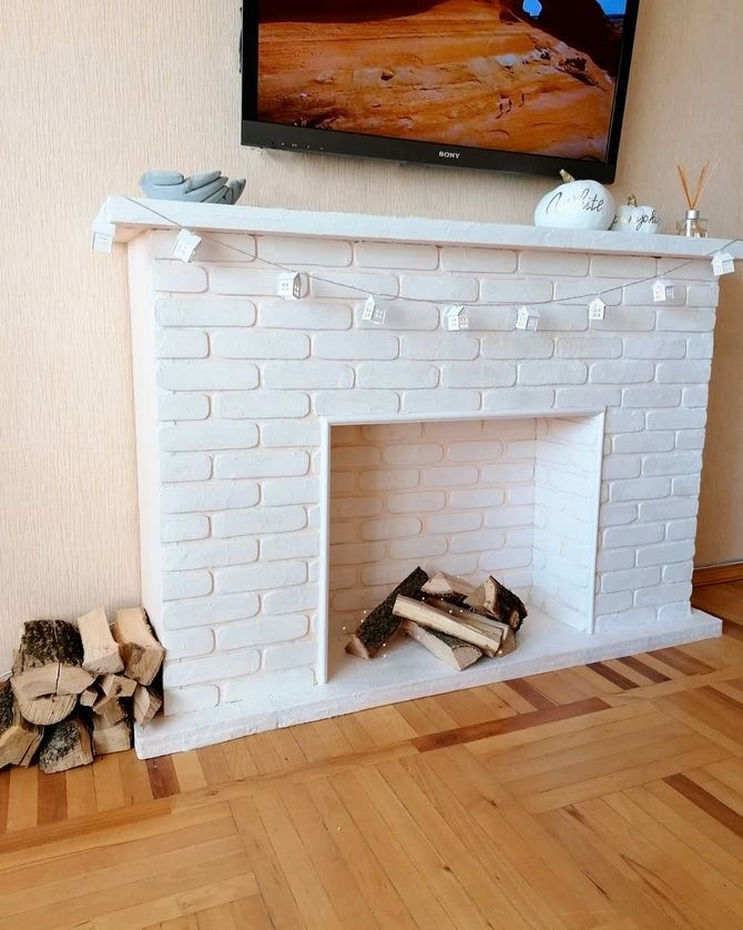 Изготовлен из материалов, похожих на камин из белого кирпича. Добавлена вставка, чтобы камин выглядел полным сложенных дров. Это простая идея, но она немного украшает комнату.