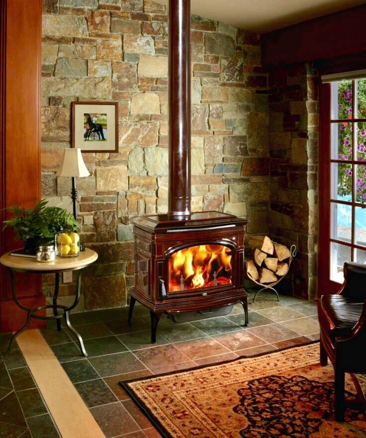 Конечно, мебель также придется отодвинуть на солидное расстояние, а стены пропитать огнезащитой и покрыть изолирующими материалами (после этого их можно выложить плиткой, например, такой же, как на полу). В этом случае, печь можно поставить к стене на расстояние, немного меньшее, чем требуется (метр).