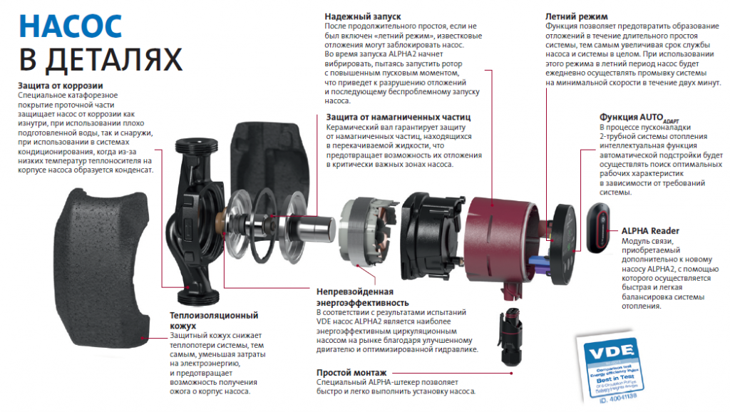 Базовая версия установки Альфа считается одной из лучших в общем сегменте циркулярных насосов. Сегодня набирает популярность и новая версия Alpha2, в список достоинств которой входит энергоэффективность, устойчивость к повреждениям и повышенная надежность в любых условиях. Кстати, потребляемая мощность этой модели в режиме ожидания составляет всего 800 кВт. Как показывает практика, при такой подаче циркуляционный насос «Грундфос» способен обеспечить напор до 8 м, что позволяет обслуживать частные домовладения площадью до 300 м 9 .