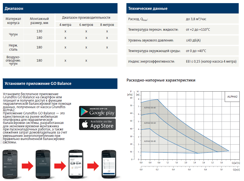 Большинство видов моделей циркуляционных насосов Грундфос схожи по своим параметрам, поэтому можно рассмотреть два наиболее популярных образца. Сравнительно недавно появился насос Alpha2, его можно назвать идеальным вариантом для систем кондиционирования и отопления. У него следующие технические характеристики: