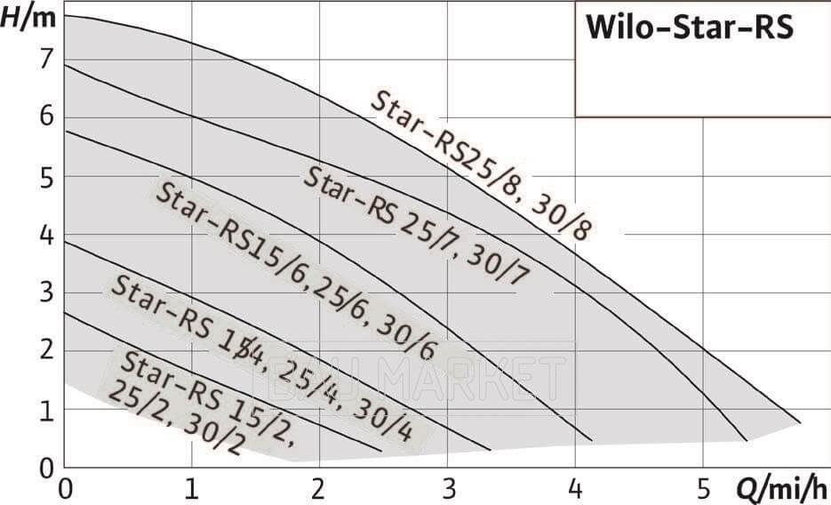 Рабочее поле Wilo Star RS 25/8 в сравнении с другими насосами данной серии отражено на Рис. 4. Графики наглядно представляют зависимость напора от объёма перекачиваемой жидкости (для удобства указана в кубометрах в час), а дополнительная возможность оценки характеристик других моделей серии поможет убедиться в правильности выбора.