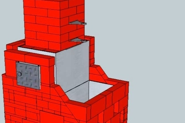 7 и 8 ряды выкладывают кирпичами, установленными на ребро. Устанавливают дверку камеры для камней. Над 8 – ым рядом прокладывают металлические пластины.