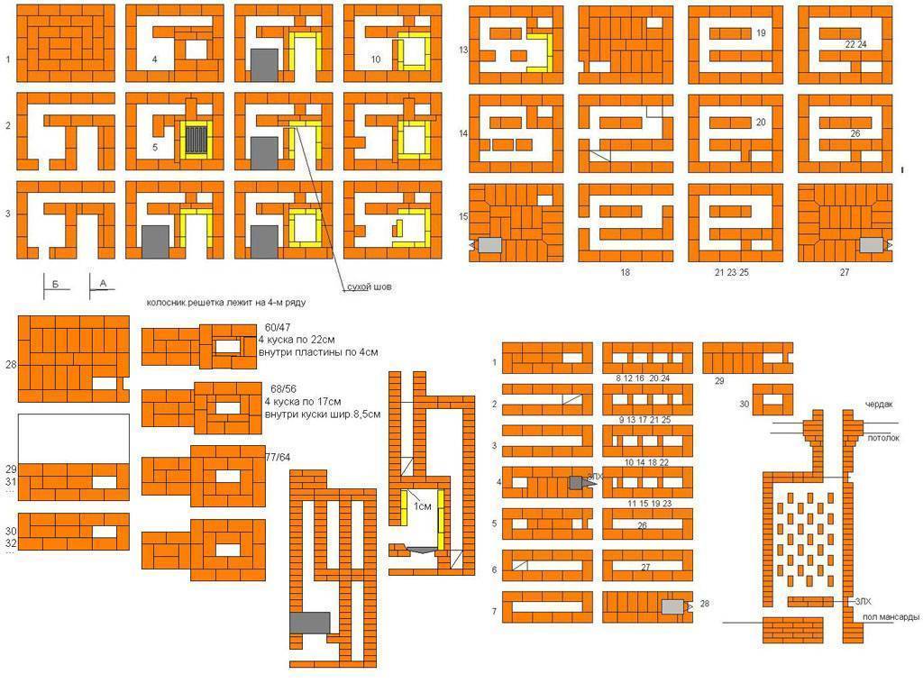 - 4-5 ряды – устанавливается внутренняя перегородка дымохода. Здесь с задней стенки выкладываются вышибные кирпичи. С их помощью можно будет чистить дымоход.