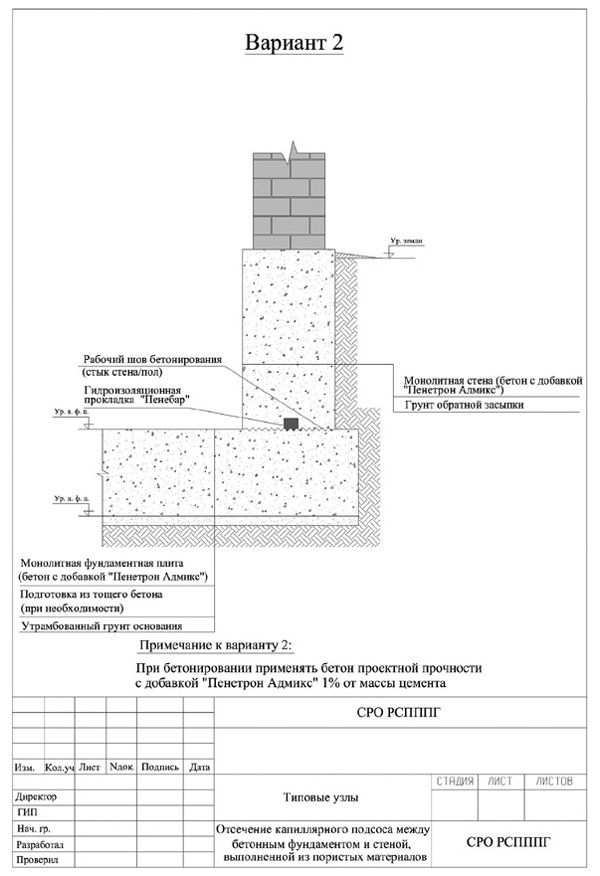 - На стадии строительства проникающая гидроизоляция фундамента обеспечивается добавлением в состав замешиваемого бетона сухой смеси типа «Пенетрон Адмикс» (или других марок) . Это изменяет структуру бетона, превращая его в качественно иной материал. Фундамент будет защищен от грунтовых вод по всей толщине строения, и вне зависимости от их глубины;