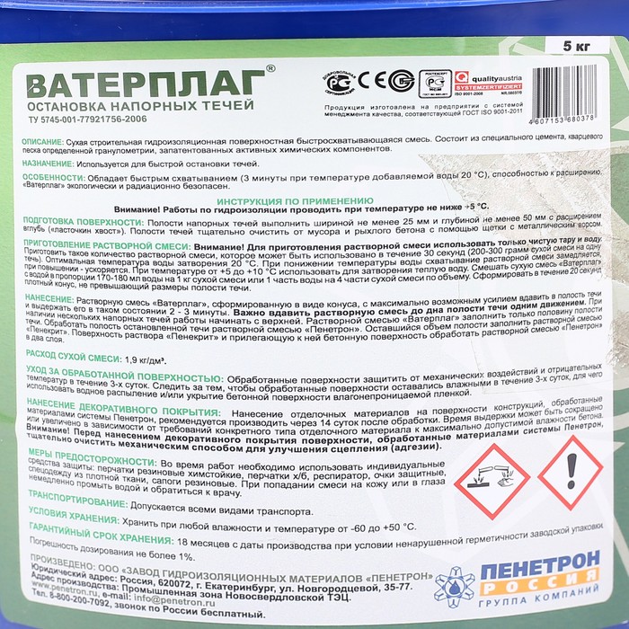 Меры предосторожности: Работы производить в резиновых перчатках и защитных очках. Продукт содержит портландцемент раздражает глаза и кожу. Во время смешивания и нанесения избегать попадания в глаза и на кожу, при попадании — промыть водой.