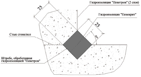 Подготовка: С помощью штрабореза и отбойного молотка выполнить вдоль трещин, швов, стыков, вводов коммуникаций, сопряжений, примыканий штрабу сечением не менее 25х25 мм. Штрабу тщательно очистить от мусора и рыхлого бетона с помощью щетки с металлическим ворсом, обильно увлажнить и загрунтовать одним слоем растворной смеси «Пенетрон» (расход 0,1 кг/м.п.). Важно! Перед нанесением материалов системы Пенетрон увлажнить бетон водой до максимально возможного его насыщения.