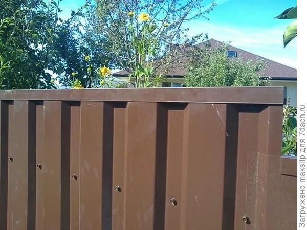 Планку «надевают» на верхний край забора. В местах, где волны профлиста или рейки штакетника примыкают к ней вплотную, вкручивают саморезы либо крепят заклёпки (они менее заметны). Много крепежа не нужно ― достаточно зафиксировать планку в начале и в конце заборного пролёта, чтобы её не сорвал ветер.