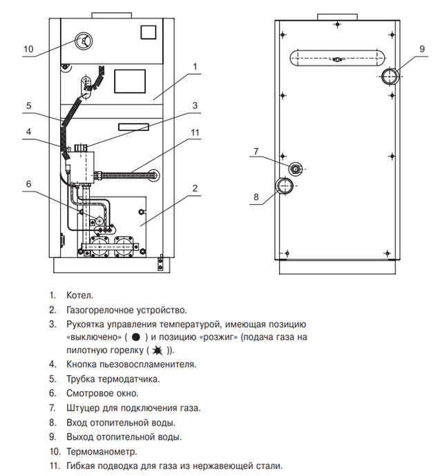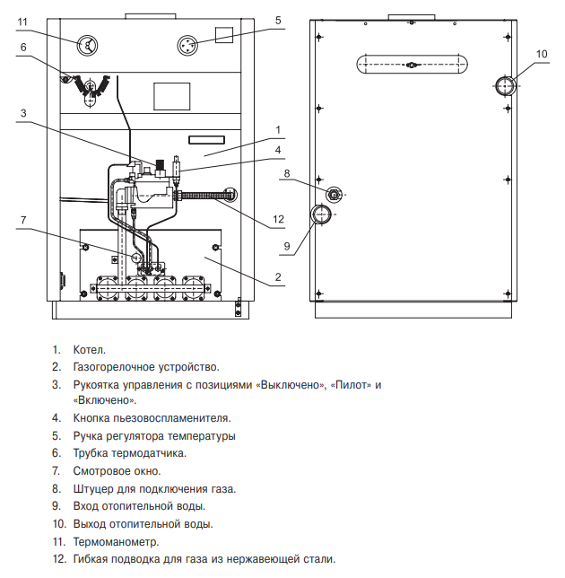 1. Устройство газовой горелки, 2. Ручка управления, 3. Пьезо-воспламенитель, 4. Регулятор температуры, 5. Смотровое окно, 6. Подключение газа, 7. Вход отопительной воды, 8.Мощность отопительной воды, 9. Указатель температуры, 10. Горячее водоснабжение; 11. Горячее водоснабжение; 12. Съемная верхняя крышка.