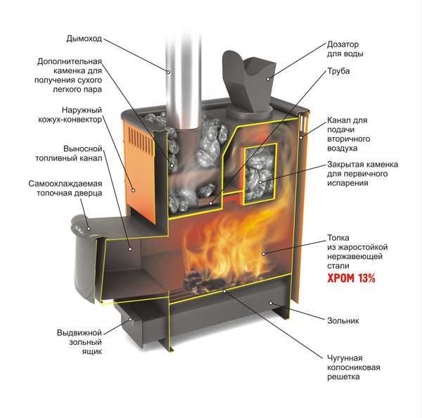 Буржуйки представлены на рынке разными модификациями, но все они имеют схожую конструкцию, включающую металлический корпус и трубу для отвода дыма. Внутри корпуса находятся основные рабочие отделения: