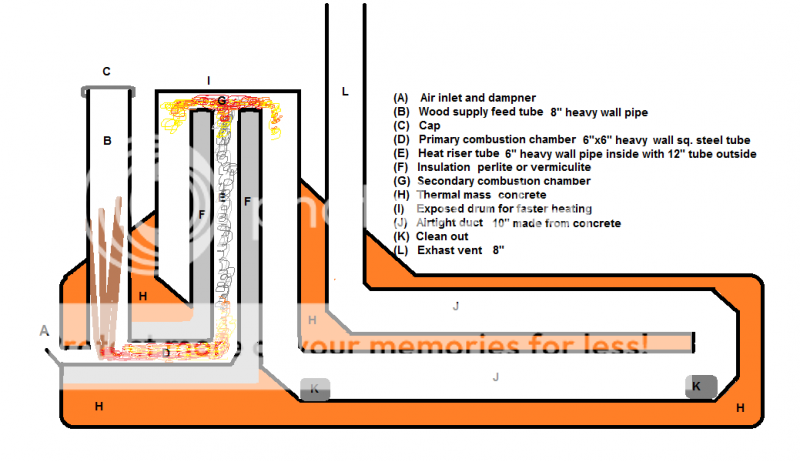 Выше намного лучше изображение, показывающее огромную мощность изолированного стояка тепла, сжигающего дым и приводящего в действие всю систему.