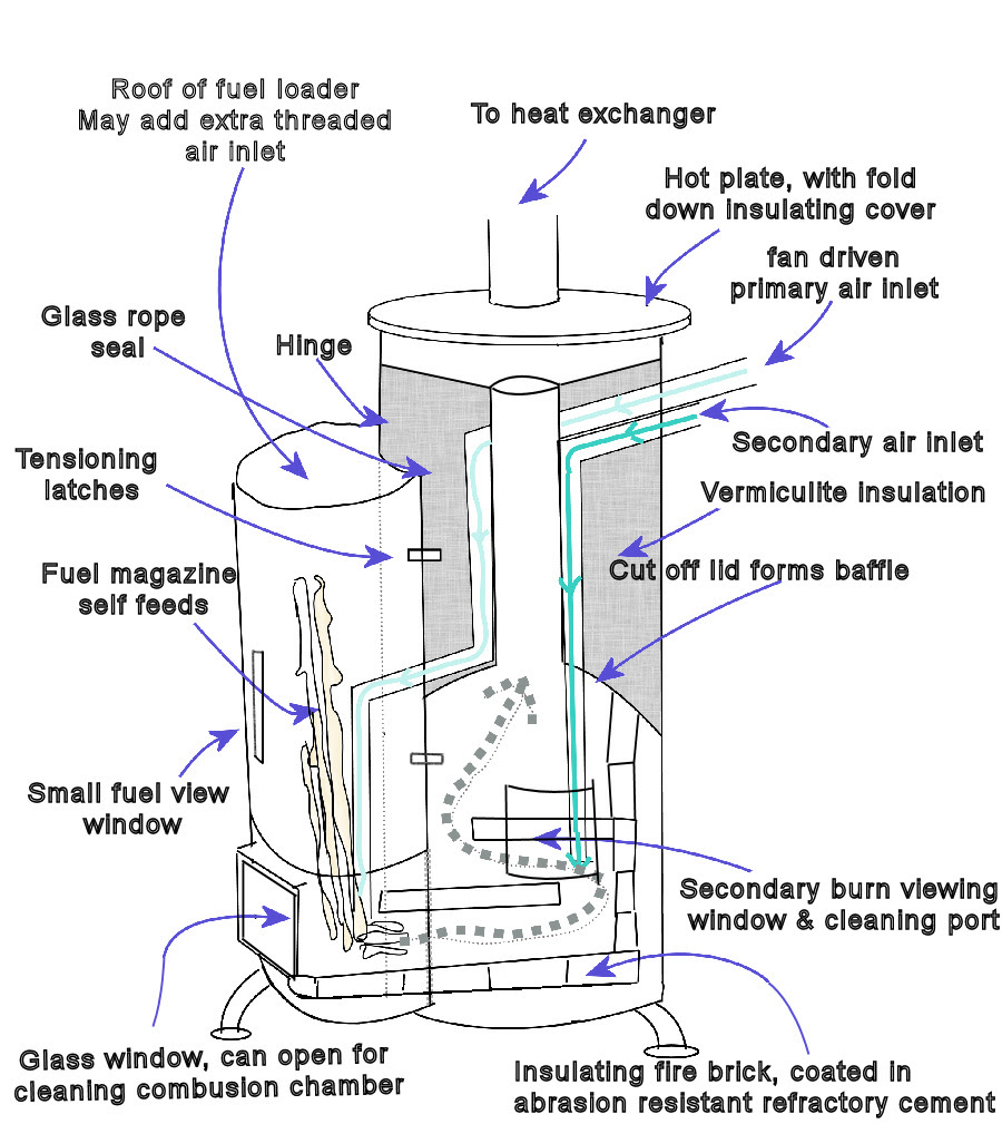 Кастрюля находится прямо над камерой сгорания, поэтому горячие газы контактируют с ней сразу после сгорания, уменьшая дымность.