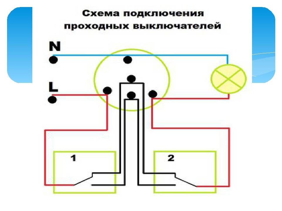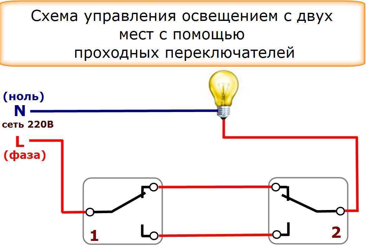 Принцип схемы подключения проходного выключателя с 2х мест прост.