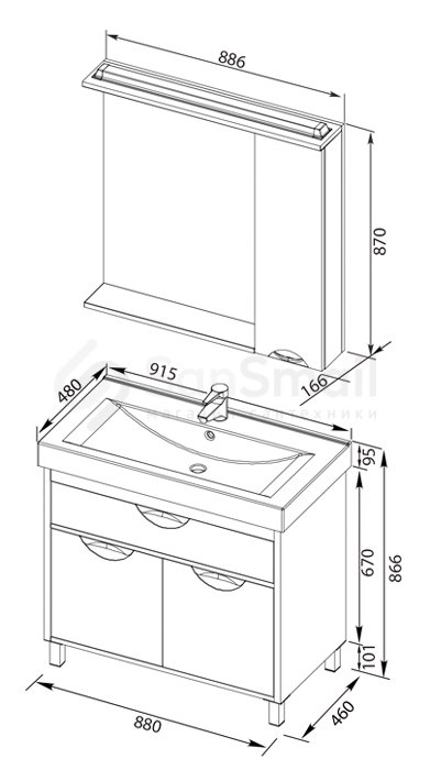 - Для компактной ванной комнаты выбирайте напольный мойдодыр – его размеры не превышают 90см (ширина тумбы), а вот подвесные наборы могут быть полноценной мебелью и иметь габариты до 1,5 метров шириной.