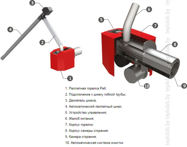 Горелка для пеллетного котла является частью автоматической системы подачи и сжигания топлива. На практике это означает, что устройство отвечает за следующие функции: