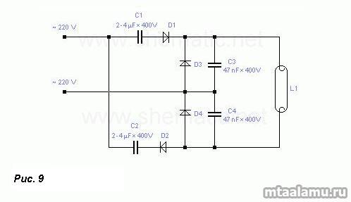 Использование умножителей напряжения.Метод помогает использовать люминесцентную лампу без электромагнитной балансировки. В ряде случаев он наиболее эффективен и продлевает срок службы аппарата. Даже перегоревшие приборы способны проработать некоторое время при мощностях, не превышающих 40 Вт.