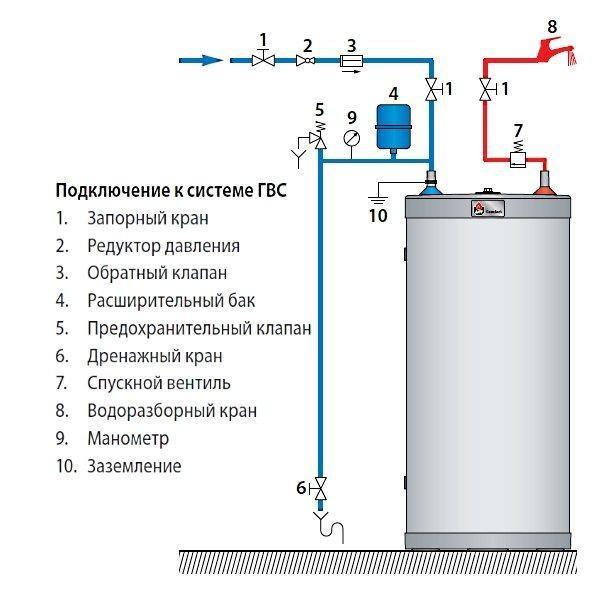 - Выполняют подключение водонагревателя во внутридомовую систему ГВС, на линии устанавливают расширительный бак, для термокомпенсации системы при нагреве.